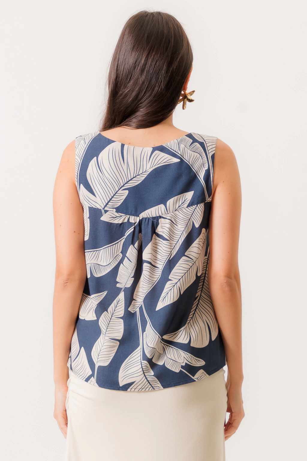 Descubra a perfeita combinação de estilo e conforto com a Regata Calmaria Azul Marinho. Esta peça é feita em viscolinho, uma mistura sofisticada de 91,3% viscose e 8,7% linho, garantindo leveza e frescor. A regata apresenta uma estampa exclusiva e modelagem solta, proporcionando um caimento natural.