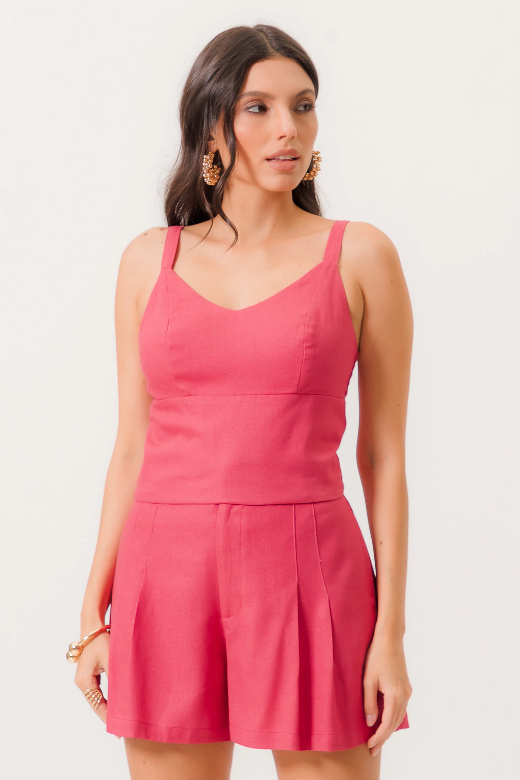 Descubra o Short De Linho Com Pregas Rosa, uma peça essencial para o seu guarda-roupa! Confeccionado com tecido de linho misto, ele combina 70% viscose, 25% linho e 5% algodão, garantindo conforto e estilo. A modelagem em linha e a cintura alta proporcionam um ajuste perfeito ao corpo, enquanto as pregas conferem um toque de elegância.