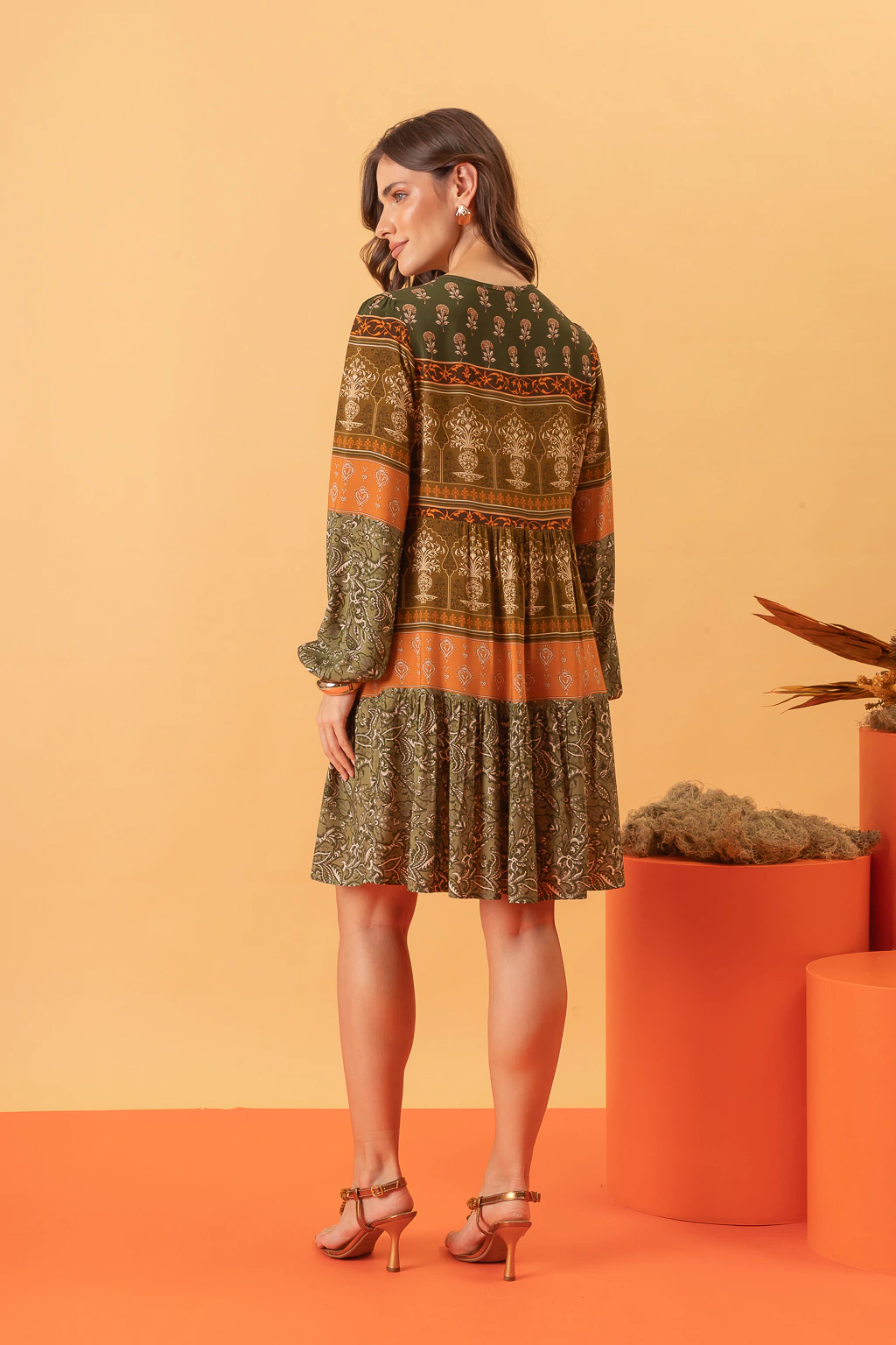 Que tal adicionar um toque boêmio ao seu visual com o Vestido Boêmia Verde? Feito com tecido de viscose nacional, possui uma estampa exclusiva que traz muita personalidade para a peça. Sua modelagem solta garante conforto, enquanto o decote arredondado com detalhe em V e amarrações adicionam um charme extra. Com recortes estratégicos, saia em camadas e mangas longas com elástico no punho, esse vestido é perfeito para quem busca estilo e praticidade no dia a dia. Composição: 100% viscose.