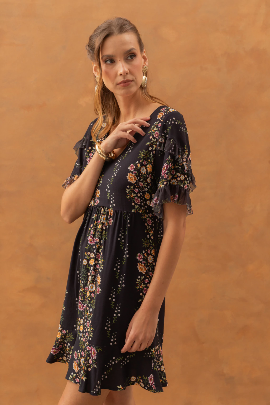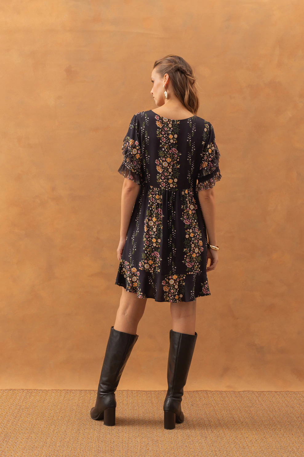 O Vestido Curto Bosque Encantado Preto é puro encanto e estilo! Feito com a mistura de viscose e linho, esse vestido possui uma modelagem solta, decote em V, manga com detalhe de babado em tule, recortes estratégicos e babado jabour na barra, garantindo um caimento perfeito. A estampa exclusiva dá um toque único à peça. Perfeito para diversas ocasiões, desde um passeio no parque até um jantar especial. Composição do tecido principal: 91,3% viscose, 8,7% linho. Sinta-se leve, elegante e cheia de estilo com o Vestido Curto Bosque Encantado Preto!