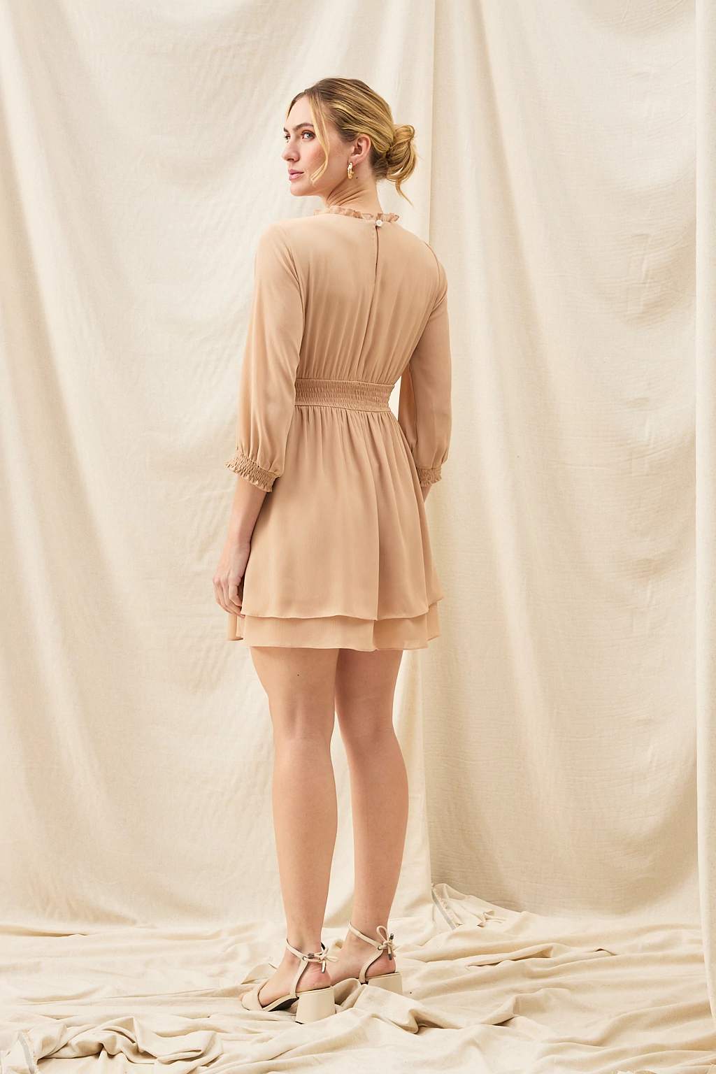 O destaque fica para o recorte com babadinho aplicado na saia de duas camadas, garantindo movimento e fluidez em cada passo. O cós largo com elástico na cintura oferece conforto e ajuste perfeito ao corpo, além do abotoamento nas costas que facilita o vestir. As mangas 3/4, finalizadas com punho de lastex, completam a peça com um toque moderno e delicado.