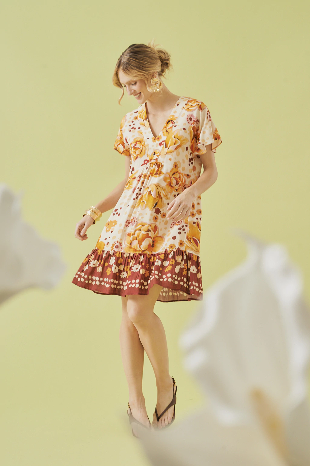 Sua modelagem solta estilo bata garante liberdade de movimento e leveza, enquanto o decote V com pala proporciona um toque delicado e moderno. O recorte abaixo do busto realça a silhueta de forma sutil, e a camada de babado na barra adiciona fluidez e feminilidade à peça.