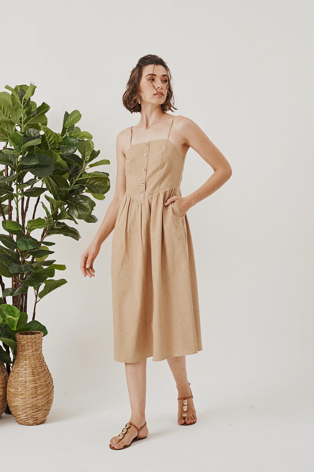 Descubra o charme e a leveza do Vestido Midi com Botões, uma peça essencial para quem valoriza conforto aliado à sofisticação natural. Confeccionado em tecido de fibras naturais texturizado com aspecto rústico, este vestido é perfeito para compor looks elegantes e frescos nos dias mais quentes.